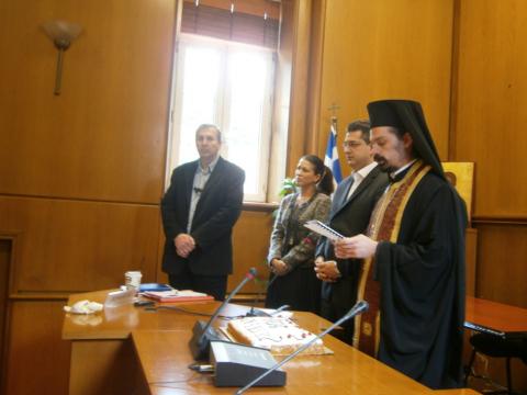 Στη συνέχεια, παρουσία του Πατρός Χριστοδούλου – Εφημέριου του Ιερού Ναού Αγίου Ελευθερίου (που ευλόγησε την Βασιλόπιτα), του Περιφερειάρχη κ. Απόστολου Τζιτζικώστα, της Αντιπεριφερειάρχη Εξωστρέφειας, Νέων Τεχνολογιών και Καινοτομίας κας Τζελίνας Μακραντωνάκη, σύσσωμου του Δ.Σ. του ΣΕΠΕΚΕΜ και του συνόλου των υπαλλήλων, πραγματοποιήθηκε η κοπή της πρωτοχρονιάτικης Βασιλόπιτας του Τοπικού Τμήματος Θεσσαλονίκης.